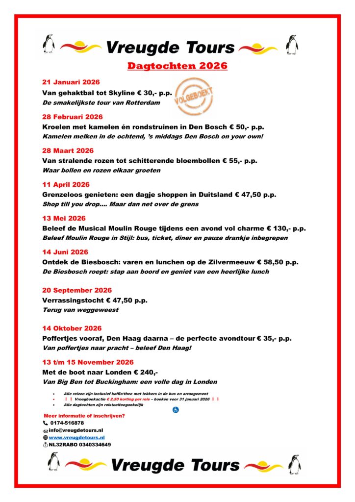 Samen met Vreugde Tours organiseren we de volgende dagtochten!